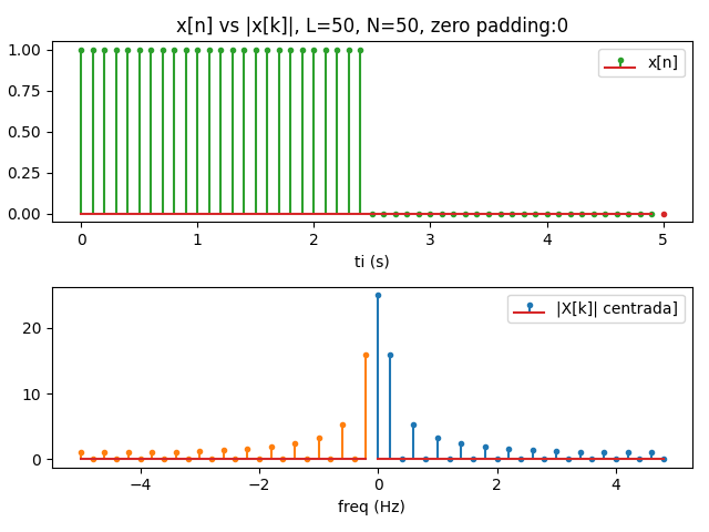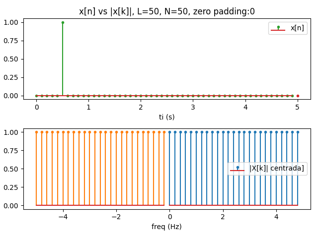 # INGRESO L = 50 # Tramos en un periodo # señal es impulso unitario periódico d[n], rectangular ancho "pequeño" f0 = 0.2 # frecuencia fundamental de señal ancho = 1/f0/L # ancho del impulso rectangular n0 = 0.5 # desplazamiento en tiempo xt = lambda n: np.heaviside(n-n0,1)-np.heaviside(n-n0-ancho,1) # para DFT N = 1*L # N par mayor que L, tramos DFT, FFT