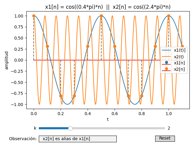 Se actualiza la parte gráfica a la forma de objetos fig, graf para crear los objetos interactivos de barra de desplazamiento (slider) k , botón Reset y cuadro de texto para la observación si es o no alias.