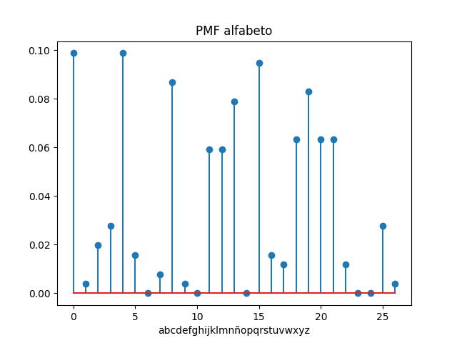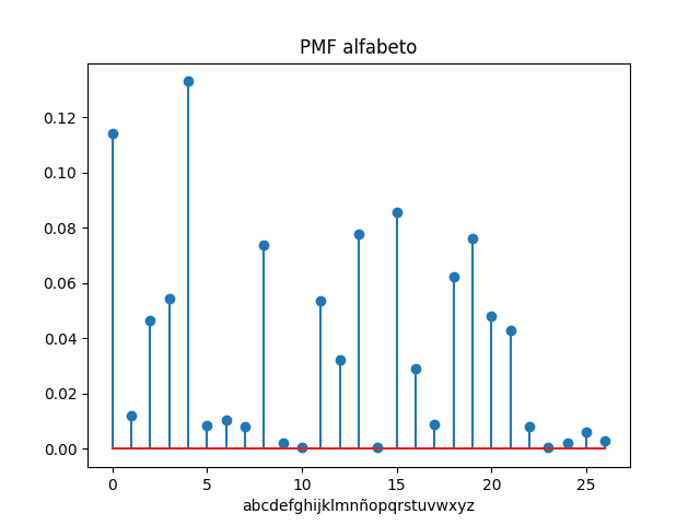 Para el modelo se requiere estimar función de probabilidad de masa (pmf), tomando como base solo el alfabeto incluyendo la letra 'ñ', sin discriminar mayúsculas y minúsculas.
