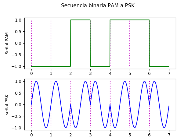 plt.suptitle('Secuencia binaria PAM a PSK')