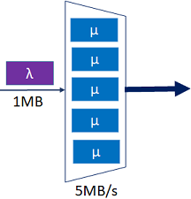 Para transmisión de datos se dispone de un multiplexor con capacidad de 5 MB/s que sirve a conexiones que llegan acorde a un proceso Poisson con tasa λ y ocupan 1Mb del ancho de banda del enlace con un tiempo de uso exponencialmente distribuido con parámetro µ.