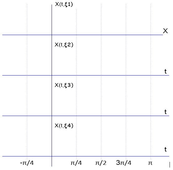 X(t, \xi_1) = 1 X(t, \xi_2) = cos(t) X(t, \xi_3) = sen(t) X(t, \xi_4) = e^{-|t/\pi|}cada una con probabilidad 0.1, 0.25, 0.3, 0.35 respectivamente.