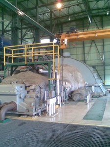 El gas (vapor a alta temperatura y presión) golpea las aspas del generador, el mismo que a determinada velocidad angular producirá energía eléctrica. El generador es de un diámetro aproximado de 8 metros, lo que nos da una idea del gran generador en cuestión.