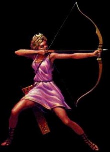 Ártemisa se mantuvo eternamente virgen y joven, por lo que siempre fue un emblema de las doncellas jovenes. Nunca conoció la dependencia a hombre. Su único placer era la caza, y debido a esto andaba siempre armada con una arco, con el que cazaba y perseguía a sus víctimas que iban desde veloces ciervos hasta humanos caídos en desgracia. Uno de sus castigos clásicos, es enviar la muerte a las mujeres que van a dar a luz. Las muertes repentinas e indoloras son también de su cosecha. Es muy propicia a la cólera y es en extremo vengativa.