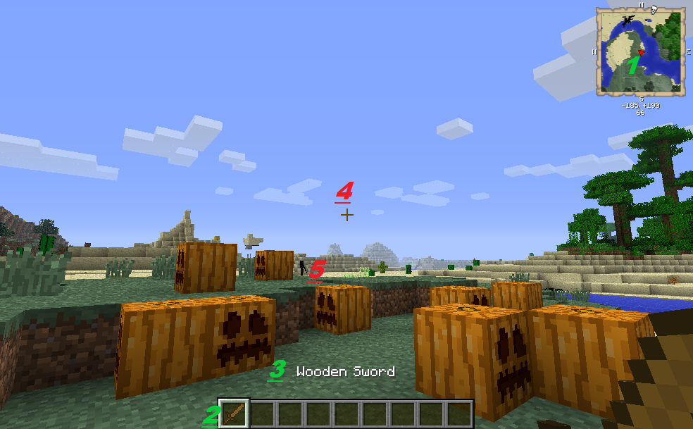 3) el nombre del ítem seleccionado como pueden ver es una espada de madera el tipo mas débil de espadas, pero no se preocupen esta en modo creativo no puedo morir ( mas adelante cubriré los modos).