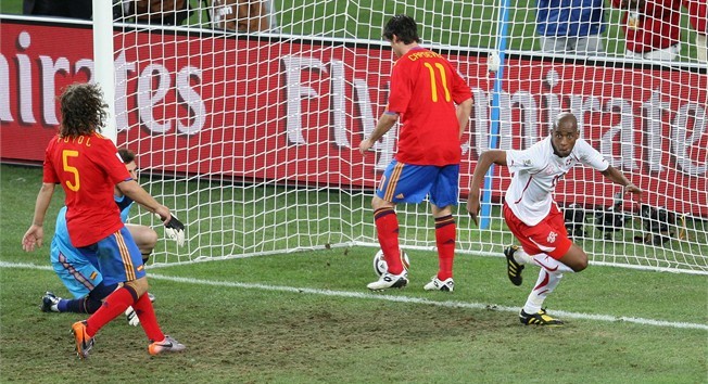 Suiza dio la gran sorpresa de la primera jornada en la Copa Mundial de la FIFA Sudáfrica 2010 al vencer a España por 1-0, en el debut de ambos en la competición. El partido, válido por el Grupo H, se jugó en el Estadio Durban de la ciudad homónima el miércoles 16 de junio del 2010.A nadie sorprendió el desarrollo de las acciones durante la primera parte: de un lado, España en el control del balón, terreno y el ritmo de juego; del otro, Suiza abroquelada en su campo buscando cómo cortar la circulación rival para salir rápido de contra. De hecho, las dos primeras situaciones de gol las produjeron Ramos y Piqué, con escalda por la derecha que terminó con un remate desviado y la otra el defensa central perdió en el mano a mano con el arquero Diego Benaglio. Tan un solo un tiro libre de Reto Ziegler, que Iker Casillas controló en dos tiempos, “inquietó” a España. En la segunda parte llego el gol para Suiza al minuto 52 tras una jugara fortuita luego de algunas carambolas , España acentuó su presión y Suiza, su decisión a jugar al contragolpe. Del Bosque buscó más profundidad con los ingresos de Fernando Torres y Jesús Navas, y cuatro veces arañó la igualdad entre los minutos 63 y 72, pero la falta de puntería le negaron el gol. Los compases finales, como era previsible, fueron propiedad exclusiva de España, que llenó de centros el área rival sin poder cabecear ninguno de ellos de manera franca. Suiza defendió con uñas y dientes su ventaja y llegó a 484 minutos sin recibir goles en un Mundial, la tercera mejor marca en la historia del torneo