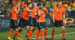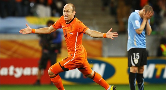 La selección de Holanda derrotó 3-2 a Uruguay en partido válido para las semifinales de la Copa Mundial de la FIFA Sudáfrica 2010, disputado en el estadio Green Point de Ciudad del Cabo. Siendo esta la tercera final de la Naranja Mecanica. El partido comenzó muy disputado, con pocas chances para dos equipos que estaban más preocupados por no recibir un gol que por marcar el primero. Apenas tímidas aproximaciones se vieron en esos primeros minutos. Pero, de pronto, el gol llegó de la manera más inesperada. Giovani van Bronckhorst recibió una pelota pegado a la banda, levantó la cabeza y mandó un impresionante disparo que se coló por la escuadra de Fernando Muslera, que alcanzó a arañar la pelota con los dedos pero sólo logró desviarla contra el poste, antes de que besara la red. Uruguay debió lanzarse al ataque entonces, frente a unos holandeses que parecían muy cómodos con la ventaja en el marcador. Los intentos celestes no fueron demasiado contundentes, hasta que, cuando expiraba la primera mitad, esta vez fue Forlán, que mandó un potentísimo disparo, que descolocó a Stekelenburg y entró por el medio del marco holandés. En la segunda mitad, los celestes empezaron con mayor determinación, y mantenían el control del balón, aunque sin generar oportunidades del todo claras. El partido se animó, y en minutos consecutivos, los dos guardametas tuvieron que hacer grandes atajadas, hasta que, a veinte del final, Holanda tuvo la suerte de los ganadores: Sneijder mandó un potente disparo, que pasó entre las piernas de Robin van Persie y dejó sin oportunidad a Muslera. Los charrúas apenas se recuperaban del golpe, cuando Holanda asestó el sablazo definitivo. El omnipresente número 10 Oranje mandó un centro milimétrico a la cabeza de Robben, cuyo remate a la esquina de la portería de Muslera fue incluso superior. Un golazo en toda la regla que le daba la tranquilidad a Holanda. Cuando se había cumplido el tiempo efectivo y Uruguay atacaba con más corazón que orden, Maxi Pereira se encontró con una pelota en la puerta del área naranja y definió como los grandes. Los últimos segundos fueron cardíacos. Los charrúas empujaron a sus rivales hacia su propia área y mandaron peligrosos pelotazos que, sin embargo, la defensa holandesa supo resolver, y asi sello su boleto a la Final de la Copa del Mundo.