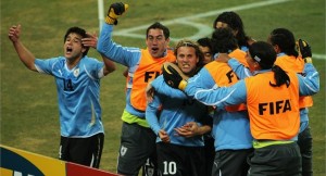 Uruguay avanzó a las semifinales de la Copa Mundial de la FIFA Sudáfrica 2010 al vencer a Ghana 4-2 en la definición desde los puntos del penal, luego de que el partido, jugado en el estadio Soccer City de Johannesburgo el 2 de julio del 2010, finalizara igualado 1-1. Los sudamericanos, que no disputaban esta instancia desde México 1970, se impusieron con entereza, remontaron el resultado y hasta pudieron perder en la última jugada, cuando Asamoah Gyan marró un tiro desde los 12 pasos. En los primeros 10 minutos ninguno pateó al arco, hasta que Luis Suárez, tras una buena acción forzó al arquero a lanzar al córner una pelota que ejecutó con precisión. Esas acción y un rebote que manoteó el portero ghanés luego de un tiro de esquina, fueron las aproximaciones uruguayas. Los centroafricanos se animaron, empezaron a salir y generaron varias llegadas. Tuvieron tres clarísimas en un cabezazo de Isaac Vorsah, un tiro de afuera del área de Asamoah Gyan y una chilena de Prince. Ghana inclinó la cancha, se hizo dueño del balón y llegó al gol sobre el final cerca del minuto 47 en un fuerte remate de 40 metros, Sulley Muntari quebró la férrea defensa Celeste. El capitán y estrella de Uruguay, Diego Forlán, niveló el tanteador, tras un tiro libre que superó por alto a Kingson y sacudió las mallas. Con la igualdad, el partido se hizo entretenido. Ghana dispuso de una ocasión en los pies de Gyan, que exigió a Fernando Muslera con un potente derechazo. Suárez definió de manera imprecisa una asistencia de Forlán. Los remates de media distancia se repitieron de cada lado, sobre todo por parte de los centroafricanos y de a poco, los conjuntos se convencieron de que el cotejo transitaría hacia el tiempo extra. La prórroga exhibió a dos equipos que se repartieron el balón y abusaron del pelotazo. Ghana fue quien tuvo mayor determinación sobre el cierre y pudo definir el encuentro en el último hálito: Gyan reventó el travesaño en el primer penal que falló en el certamen. En la jugada anterior, Suárez vio la tarjeta roja. En la serie desde el punto del penal, Muslera se erigió en el héroe al contener los disparos de Jonathan Mensah y Dominic Adiyiah, mientras que su compañero Sebastián Abreu mostró por qué le dicen Loco: picó la bola con clase y frialdad para sellar el pase de Uruguay a semifinales.