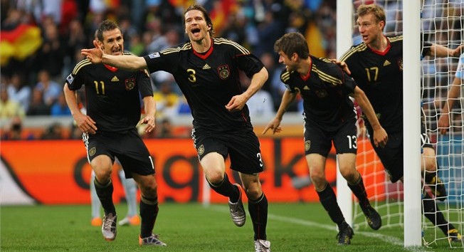 Alemania derrotó por 0-4 a Argentina en el partido de cuartos de final disputado en el estadio Green Point de Ciudad del Cabo el sábado 3 de julio del 2010. Los germanos, avanzaron a las semifinales de la Copa Mundial de la FIFA Sudáfrica 2010. El partido comenzó con una Alemania imponente, que dominaba el balón y generaba ocasiones pero no se esperaba que se adelante pronto. Un magnífico cobro de falta de Mezut Özil encontró a Thomas Müller en el área, quien libre de remató a placer y venció a Sergio Romero para concretar la primera.Los de Diego Maradona acusaron mal el golpe y sufrieron minutos de asedio total, aunque Alemania no reflejaba su dominio en ocasiones claras. Para el cuarto de hora el partido se había emparejado. La primera llegada Argentina llegó en el minuto 22 cuando Lionel Messi mandó un espectacular pase para Carlos Tévez, pero Manuel Neuer logró cortar. Desde ese momento, la posesión estuvo del lado albiceleste, mientras que Alemania esperaba atrás para lanzar peligrosos contragolpes. Por su parte, Argentina empezó a generar oportunidades, aunque no demasiado peligrosas. La primera mitad terminó con Argentina agobiando a Alemania, pero sin que sus delanteros encontrasen los espacios necesarios. Argentina sabía que tenía que marcar rápido para no exponerse a la velocidad alemana a la contra, y desde el minuto de juego fue con todo por el empate. Se olía el gol albiceleste. El portero alemán debió reaccionar con seguridad ante dos disparos, de Higuaín y Di María. Y justo cuando parecía que Argentina lograba el empate, Alemania definió el encuentro con el sello de la casa: el contragolpe. Tras un excepcional pase de Müller, Podolski se internó en el área, sacó un centro cruzado y Klose, sin marca definió caminando. Argentina se derrumbó. Intentó atacar, con más corazón que fútbol, pero no alcanzó. En una excepcional jugada por banda izquierda, Bastian Schweinsteiger dejó sembrados a tres defensores antes de cruzar para Arne Freidrich, que en el primer poste definió con un toque preciso.Y aún faltaba más. Cuando el partido expiraba, un desborde de Özil, por la banda izquierda, dejó sólo al gran delantero alemán, que festejó su partido número 100 y se quedó sólo a un gol de Ronaldo en la lista de máximos anotadores en la historia de las Copas Mundiales de la FIFA.