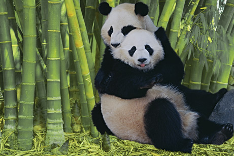 El oso panda gigante es un animal grande, parecido a un oso, con pelaje blanco largo, denso y de aspecto lanoso; las patas, los hombros, las orejas y la zona de los ojos son negras. La cola es ancha y corta. El oso panda gigante habita en los bosques de bambú del centro de China, a altitudes que oscilan entre los 1.500 y los 3.000 m.