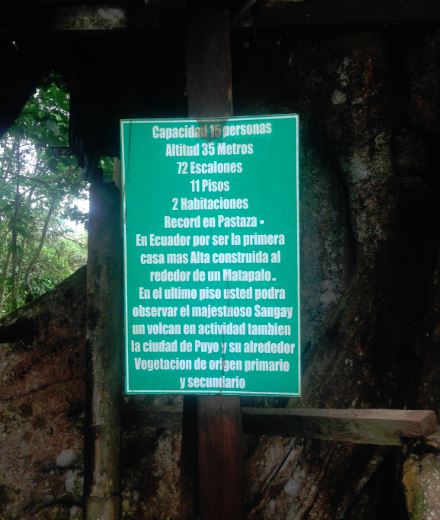 Esta casa del árbol (también muy reconocida) se encuentra ubicada en Shell vía al Puyo, está construida sobre un Matapalo de aproximadamente 200 años de antigüedad, tiene un total de 11 pisos y es considerada la casa del árbol más grande del Ecuador.