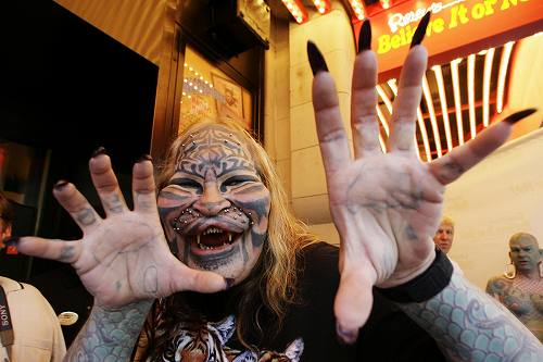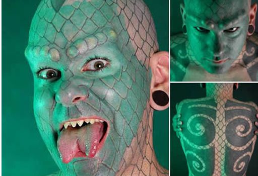 Eric Sprague nacio en 1972 y fue uno de los primeros hombres en fraccionarse la lengua. Este hombre de 37 años busca parecerse a un reptil, y para esto a invertido mas de 700 horas tatuándose, diseño de dentadura, sejas e incluso un cambio en su cabello.