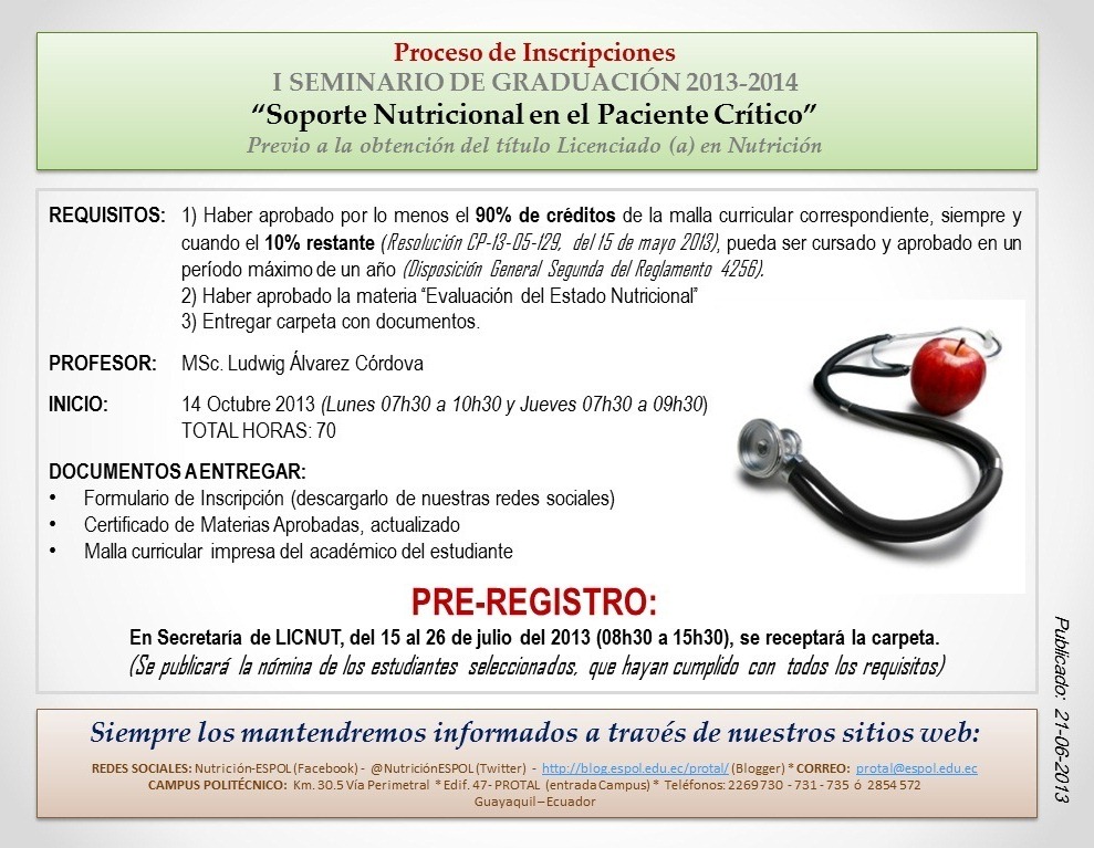 Se receptarán las carpetas con documentos, en Secretaría de LICNUT, del 15 al 26 de julio del 2013 (08h30 a 15h30).